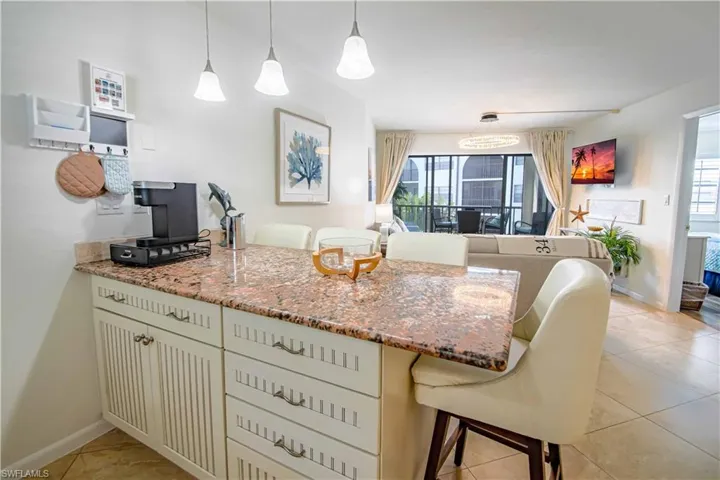 This beautiful, updated one-bedroom unit with a south-facing screened lanai offers stylish coastal décor in neutrals and blues, which now INCLUDES the furnishings inside the unit. The kitchen has stainless steel appliances, including a small dishwasher. The kitchen island has granite countertops, white Shaker-style cabinetry, and extra storage.
