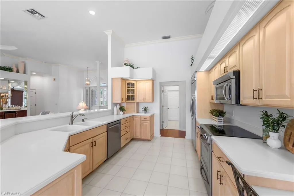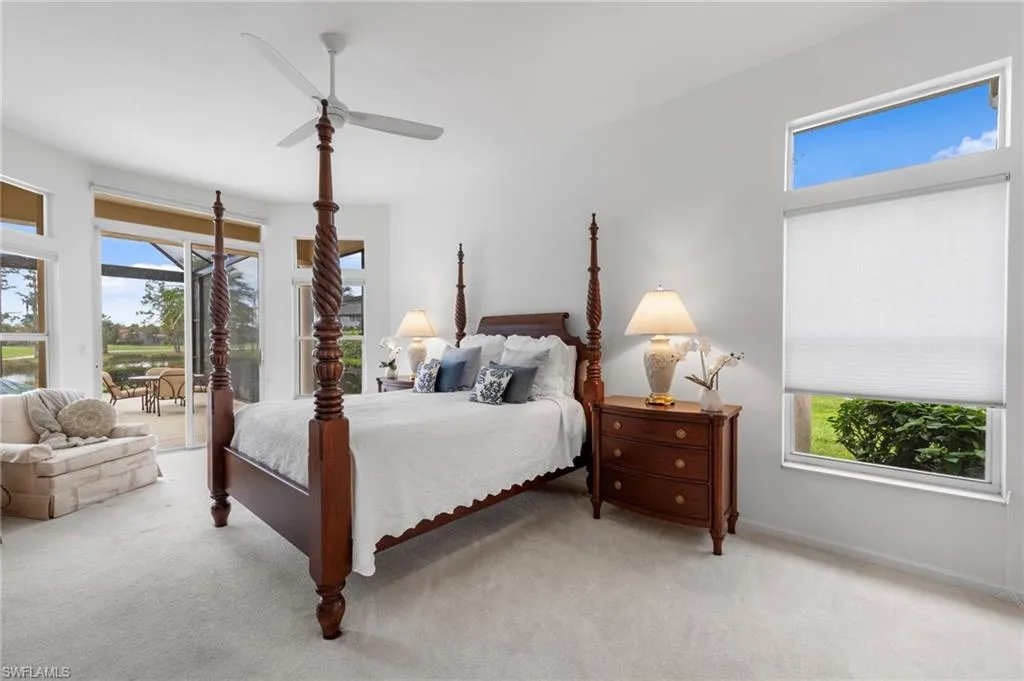 Embrace the beauty of country club living surrounded by nature in this meticulously cared-for home offering a stunning water view in Wildcat Run Golf & Country Club. Set on a nearly half-acre lot, this 3-bedroom, 3-bath residence spans approximately 2,215 sq ft of bright, open living with soaring volume ceilings, light neutral paint, and a circular driveway leading to an oversized 2-car garage. Recent updates elevate both style and peace of mind, including a new tile roof, brand-new impact-resistant sliders, and a new panoramic pool screen. The great room flows effortlessly to the dining area, built-in bar, and kitchen with a sunny breakfast nook, opening to an oversized covered lanai overlooking the sparkling pool, shimmering lake, and manicured fairway beyond. The home’s southwest orientation fills the interior with natural light throughout the day and showcases breathtaking sunset skies over the pool and lanai each evening. The primary suite provides direct lanai access, dual vanities, a garden tub, oversized walk-in shower, and a spacious walk-in closet. Two guest bedrooms provide flexibility for visitors or a home office, complemented by a shared full bath and a separate full pool bath offering convenient lanai access. Nestled among sprawling home sites, custom-built residences, and lush, mature landscaping, Wildcat Run offers a truly distinctive setting. Residents enjoy an Arnold Palmer–designed 18-hole championship course (with no waitlist for golf memberships), tennis and pickleball courts, bocce, fitness and wellness facilities, casual and fine dining, and a busy year-round social calendar—all just minutes from I-75, RSW Airport, Coconut Point, Hertz Arena, fine dining, shopping, and the beautiful Gulf beaches.