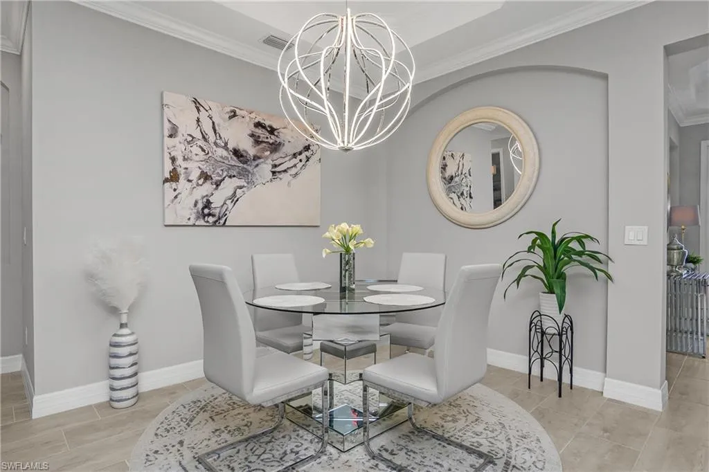 Additional features include tile flooring throughout, crown molding, tray ceilings, designer lighting, tankless water heater, whole-home surge protection, smart home features, epoxy garage flooring, and a side-entry garage. Offered turnkey furnished, this home is move-in ready.