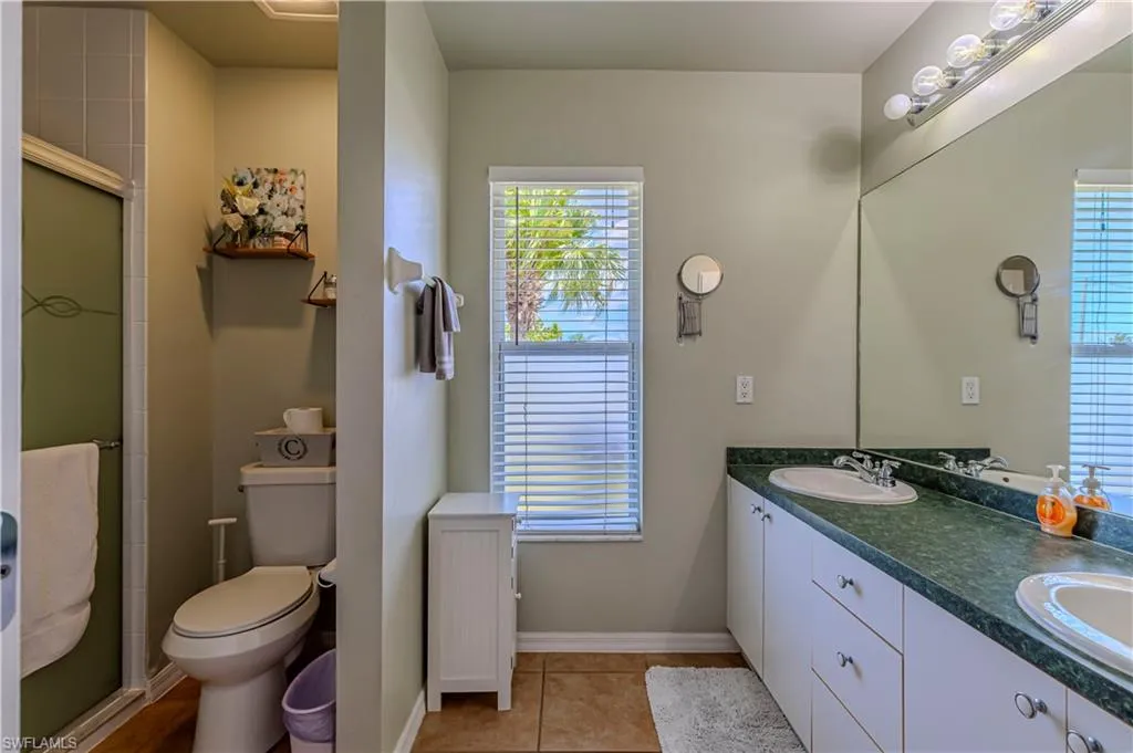 The primary suite is a true retreat with private access to the expansive screened lanai, complete with pavers and a spa, offering plenty of space to relax or entertain with room to add a pool if desired. The ensuite bathroom features dual vanities and a beautifully tiled walk in shower.